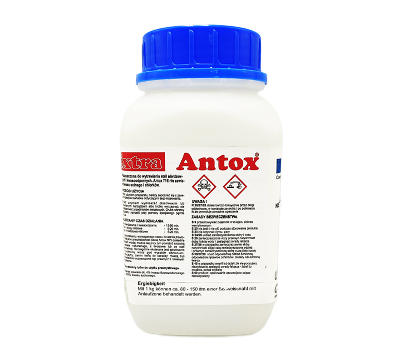 Antox 71E Plus je prozorna tiksotropna pasta, ki se uporablja za odstranjevanje ožganin in barv žarjenja z nerjavečega jekla po varjenju. Uporablja se lahko tudi na titanu, niklju in njihovih zlitinah.