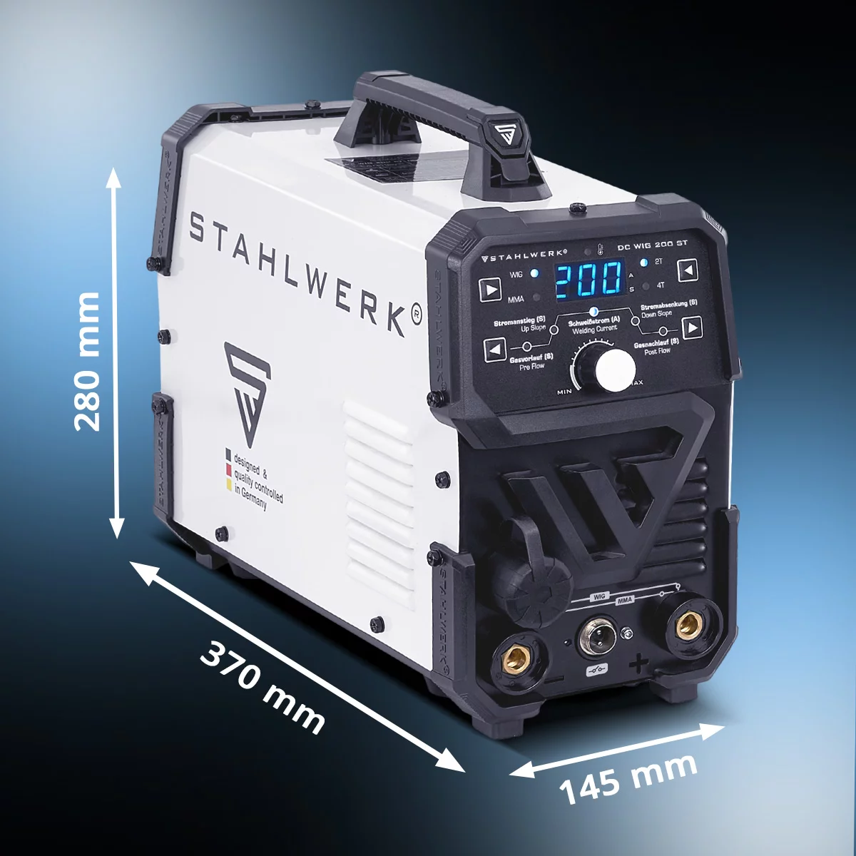 STAHLWERK DC WIG 200 ST je zmogljiv TIG varilni aparat z možnostjo varjenja z elektrodnim varjenjem (MMA) in varjenja z električno obloženo elektrodo. Med prednostmi tega kombiniranega varilnega aparata 2 v 1 z enosmernim tokom sta kompaktna zasnova in majhna teža, ki znaša le 4,65 kg. Za doseganje optimalnih rezultatov varjenja je mogoče enostavno nastaviti parametre, kot so predtok plina, povečanje toka, zmanjšanje toka in zmanjšanje plina. Čas predtoka plina (0–2 s) določa, kako dolgo teče zaščitni plin, preden se oblok vžge, kar ščiti varilno območje. Povečanje toka (0–15 s) uravnava gladko povečanje varilnega toka za nadzorovan začetek brez brizganja. Zmanjšanje toka (0–25 s) določa in postopoma zmanjšuje tok po varjenju, kar zagotavlja čist zaključek varjenja. Čas pretoka plina po varjenju (0,1–25 s) omogoča nadaljnji pretok zaščitnega plina po izklopu varjenja, kar ščiti vroči zvar pred oksidacijo in nečistočami. Ta kombinirani varilni aparat ima tudi praktične funkcije, kot sta pametno hlajenje in integrirana zaščita pred pregrevanjem. V načinu TIG funkcija 2T/4T zagotavlja priročno delovanje. V načinu 2T ostane visokofrekvenčni (HF) vžig aktiven, dokler ni sproščen sprožilec na gorilniku. V načinu 4T se oblok vžge po enkratnem pritisku in sprostitvi sprožilca. S ponovnim pritiskom in sprostitvijo sprožilca se vžig prekine. Napredna tehnologija IGBT omogoča maksimalno zmogljivost pri varjenju TIG in MMA pri 200 amperih. Varilni aparat DC TIG 200 ST IGBT je dobavljen s celovitim paketom dodatne opreme.