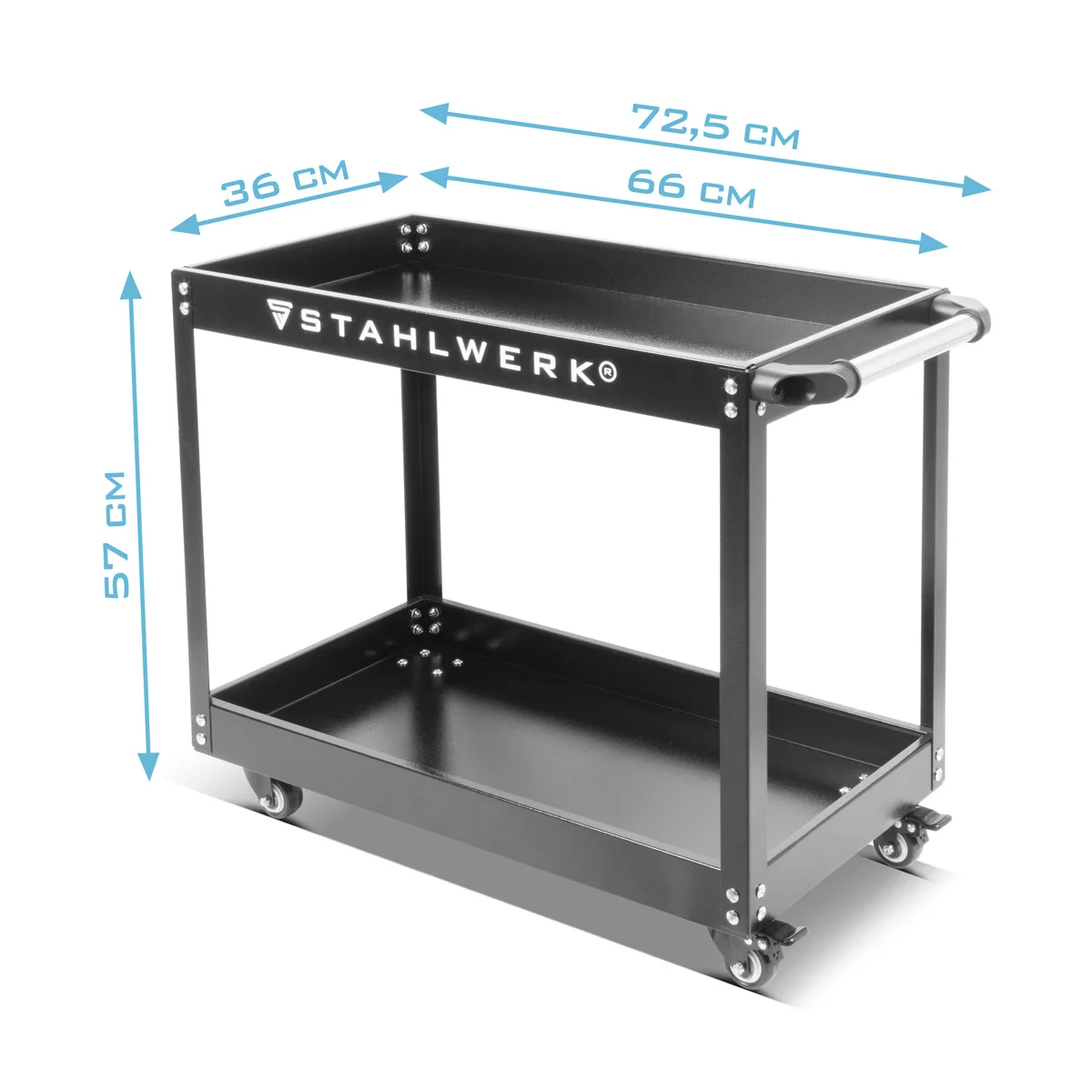 Ta praktični voziček za orodje vnese red v vsako delavnico: Opremljen z dvema prostornima policama, voziček s platformo zagotavlja veliko prostora za orodje vseh velikosti. Odprta zasnova vozička omogoča neomejen in hiter dostop z vseh strani. Globina polic zagotavlja, da vse ostane na svojem mestu in je orodje vedno na dosegu roke. Mobilni voziček ima dve fleksibilni vrtljivi kolesci z zavorami in dve fiksni kolesci iz trpežne, odporne plastike. Integriran ročaj omogoča enostavno manevriranje in premikanje vozička za orodje, tudi v omejenih prostorih. Robustna jeklena konstrukcija daje vozičku s platformo maksimalno stabilnost in vzdržljivost. Zaradi svoje kompaktne velikosti se ta večnamenski montažni voziček prilega tudi majhnim delavnicam, garažam in drugim delovnim prostorom. Zaradi visokokakovostne izdelave je ta voziček primeren za profesionalno uporabo v industriji, trgovini, trgovini in pri DIY projektih.